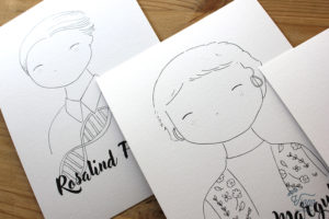 Ilustración de científicos y científicas para los meseros de una boda temática.