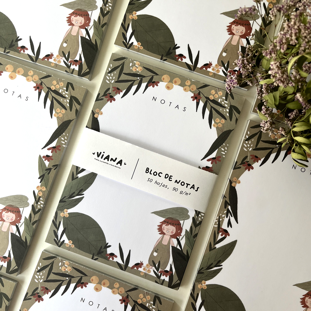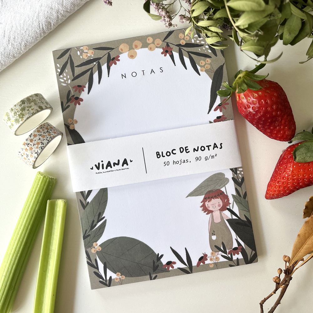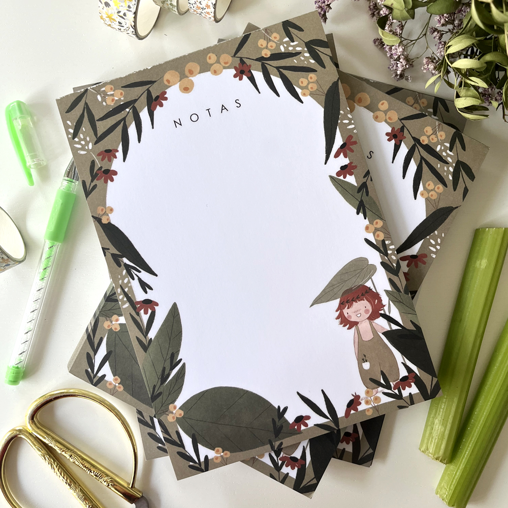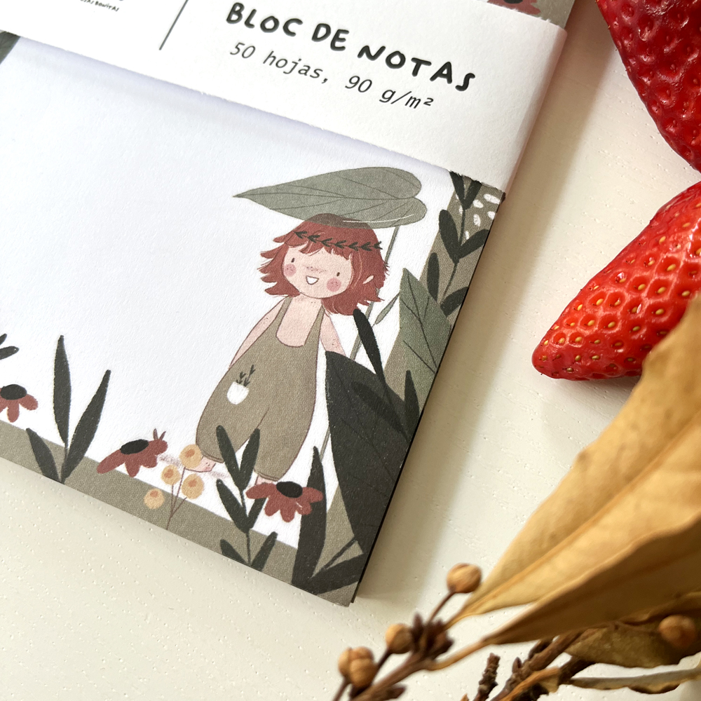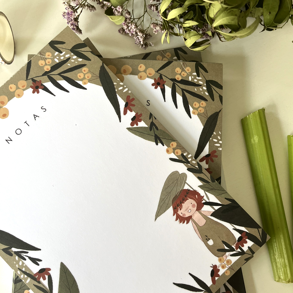 Bloc de notas ilustrado, encolado en la parte superior y con base de cartón.