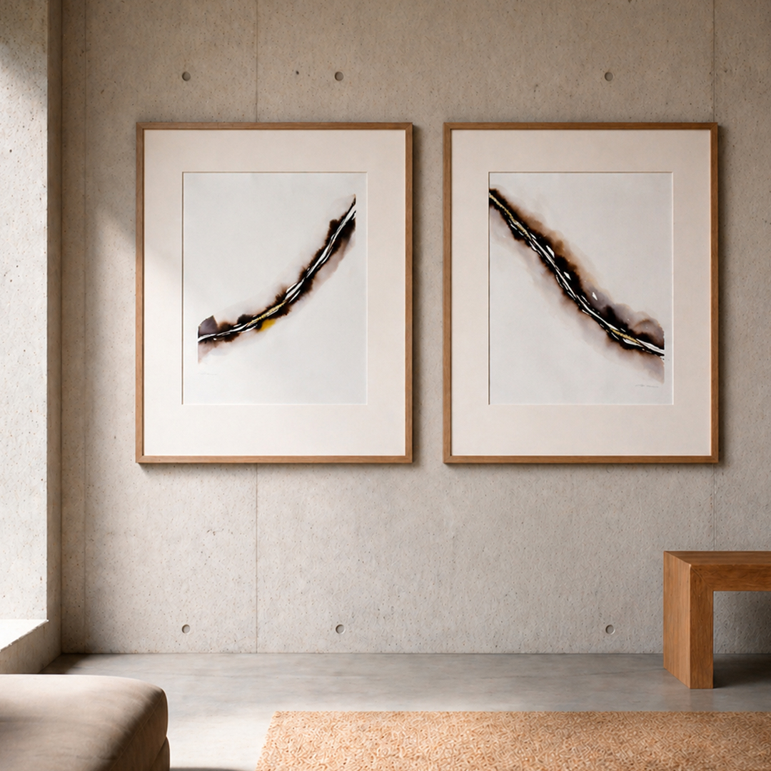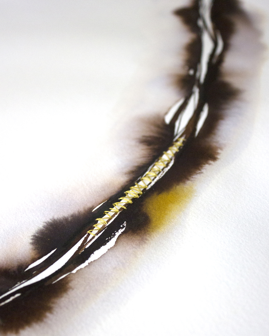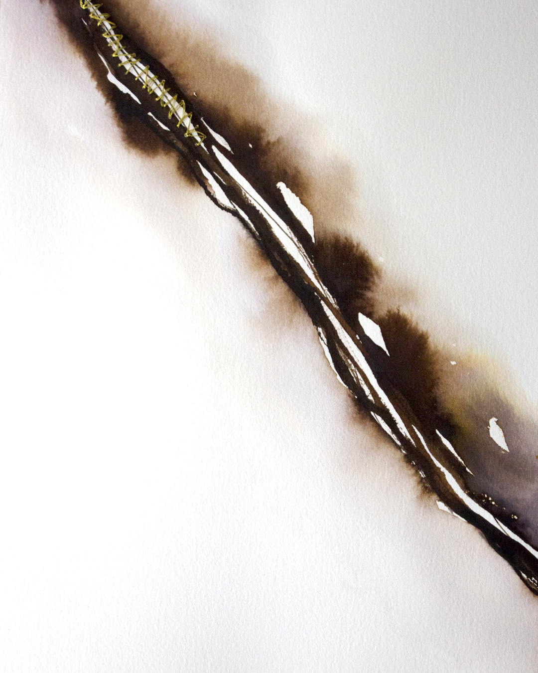 Las dos obras dialogan desde la idea de la herida y la reparación. Cada pieza presenta una grieta abierta que atraviesa el espacio blanco. Sin embargo, en medio de esa oscuridad emerge un hilo dorado que intenta suturar la fractura, transformando el daño en posibilidad.