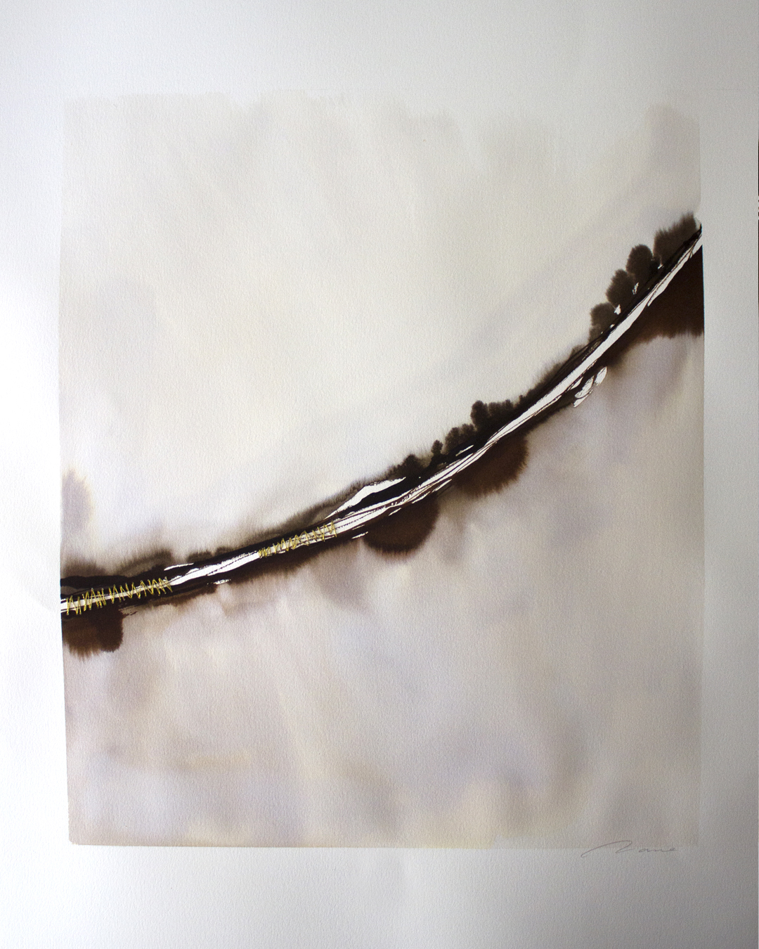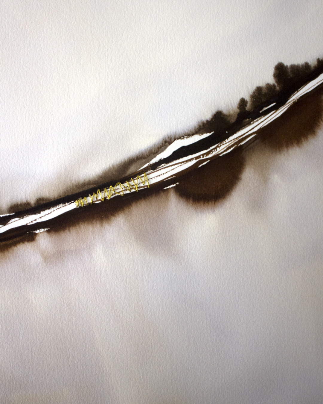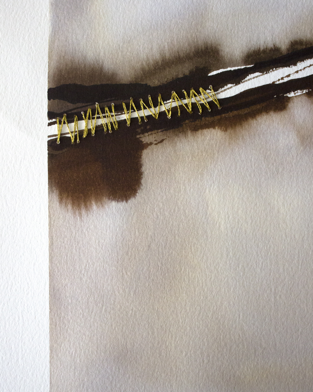 Cada pieza presenta una grieta abierta que atraviesa el espacio blanco. Sin embargo, en medio de esa oscuridad emerge un hilo dorado que intenta suturar la fractura, transformando el daño en posibilidad.