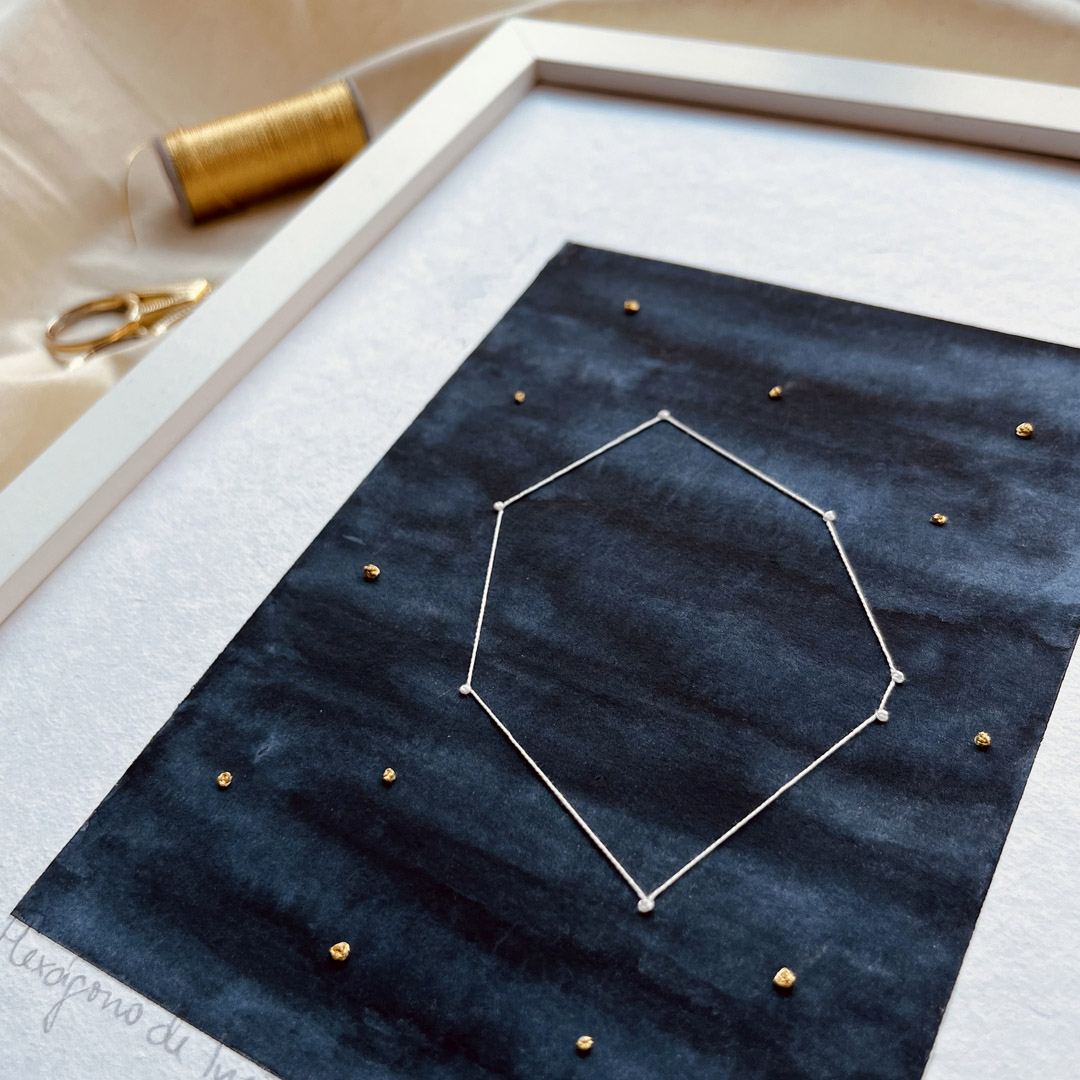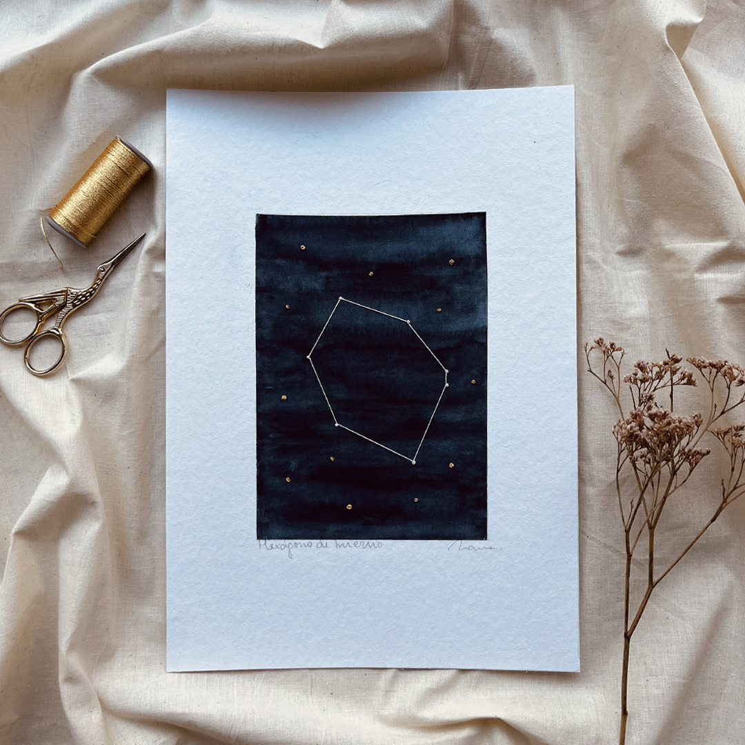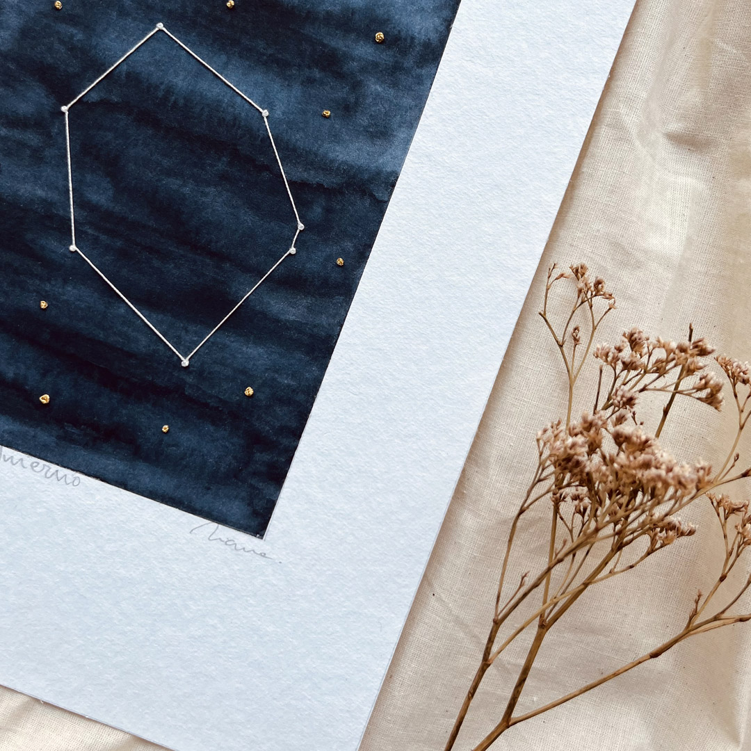 Acuarela original en papel Hahnemühle Edición Especial de 425 g/m2 libre de ácido, bordada a mano con hilo metálico DMC Diamant y perlé de Anchor.