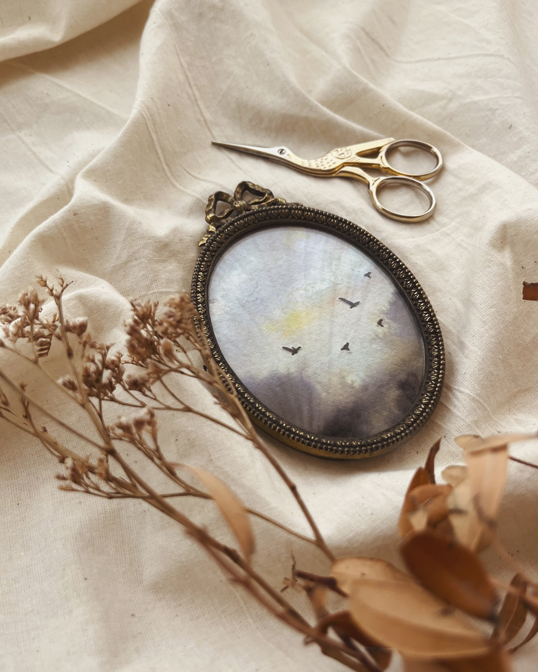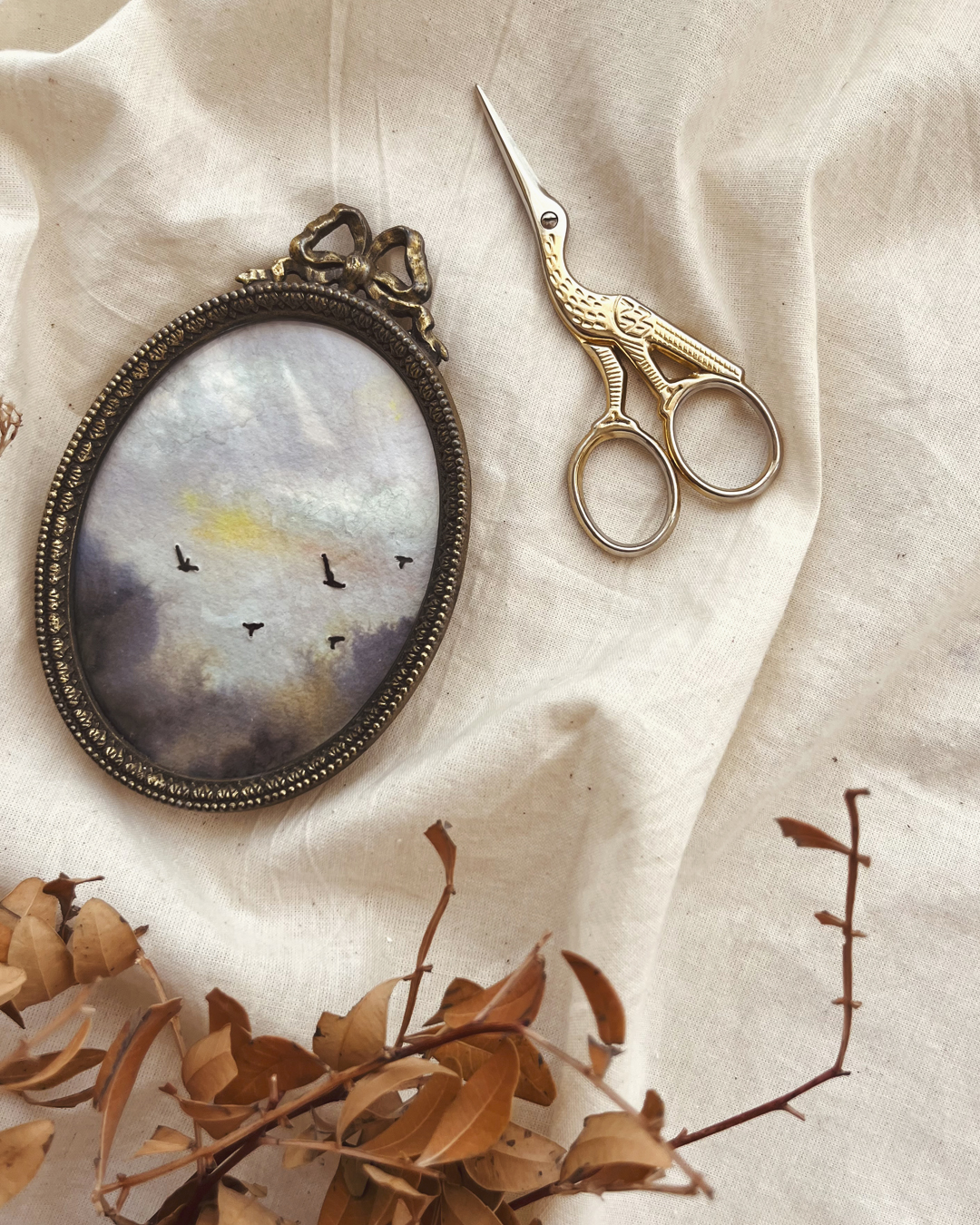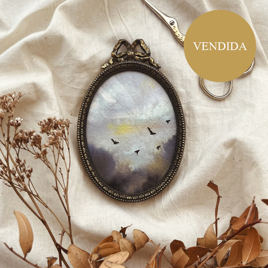 Acuarela original bordada a mano sobre papel Khadi de 320gr y 100% algodón. Hilos DMC Mouliné Spécial.