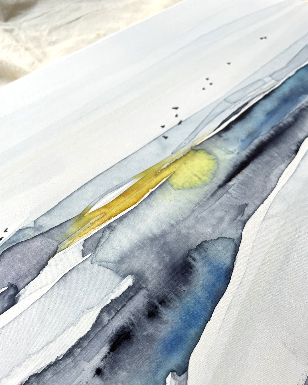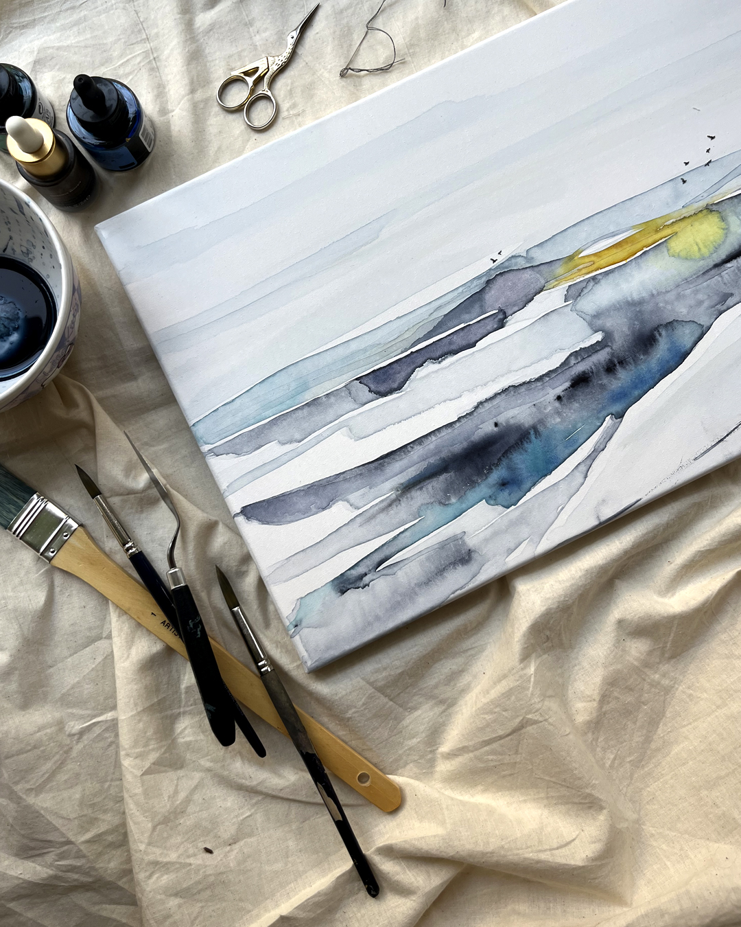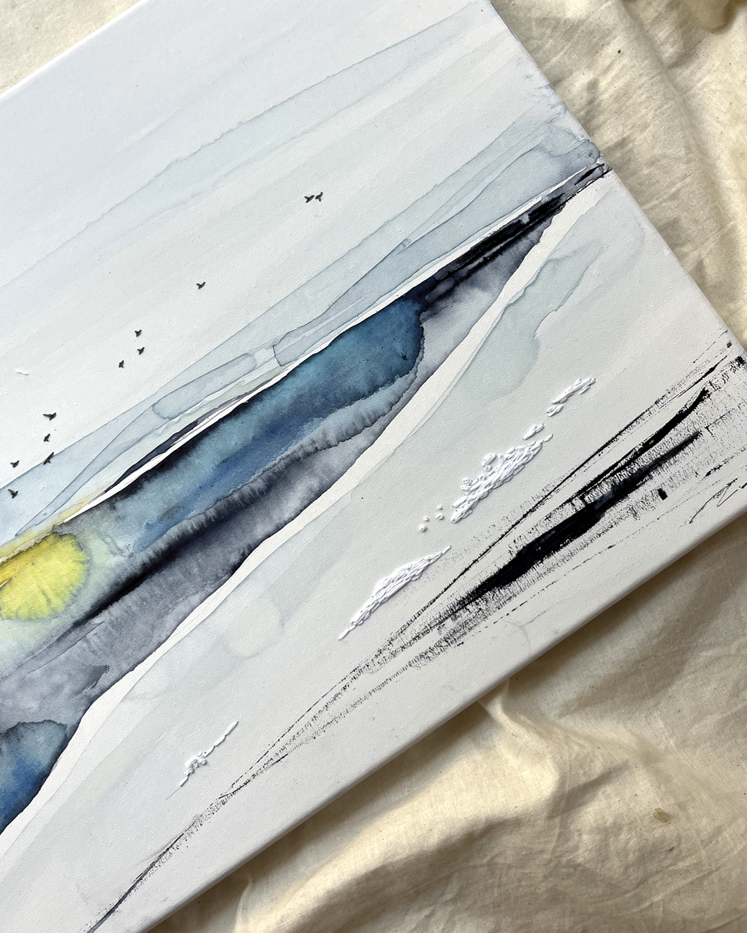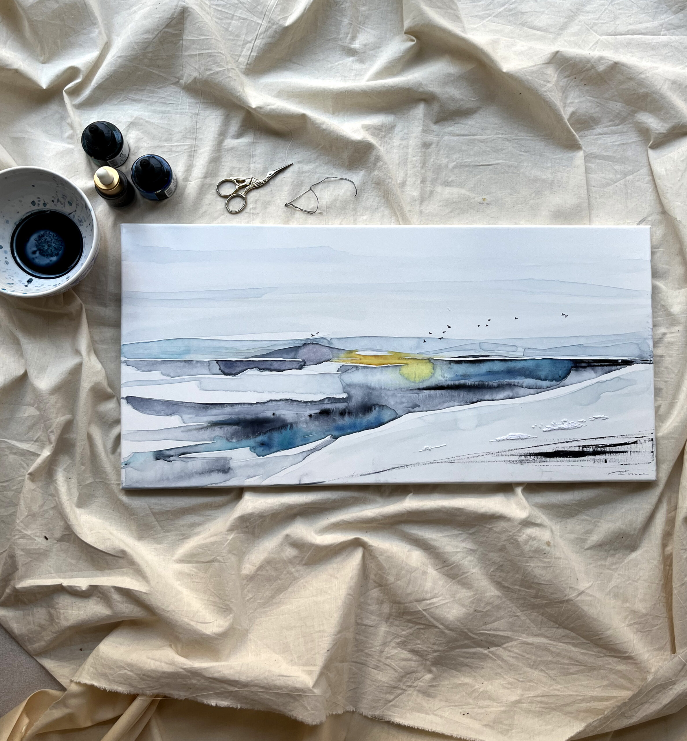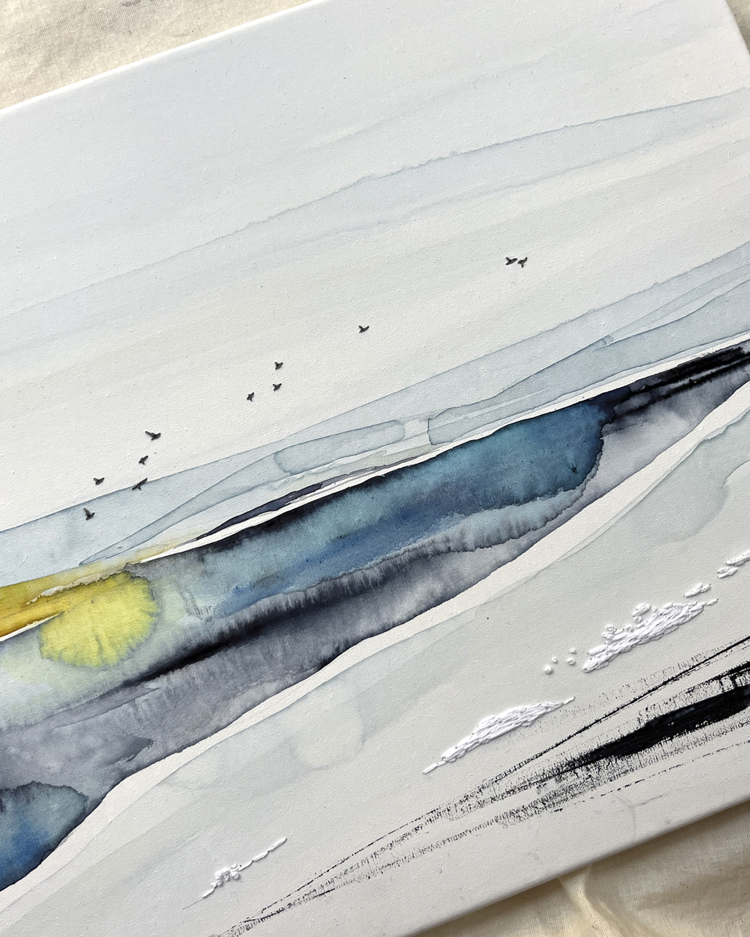 Acuarela original sobre lienzo de algodón montado en bastidor bordado a mano con hilo de algodón DMC.